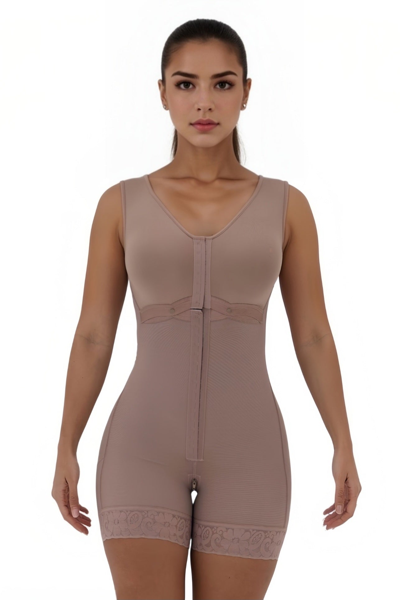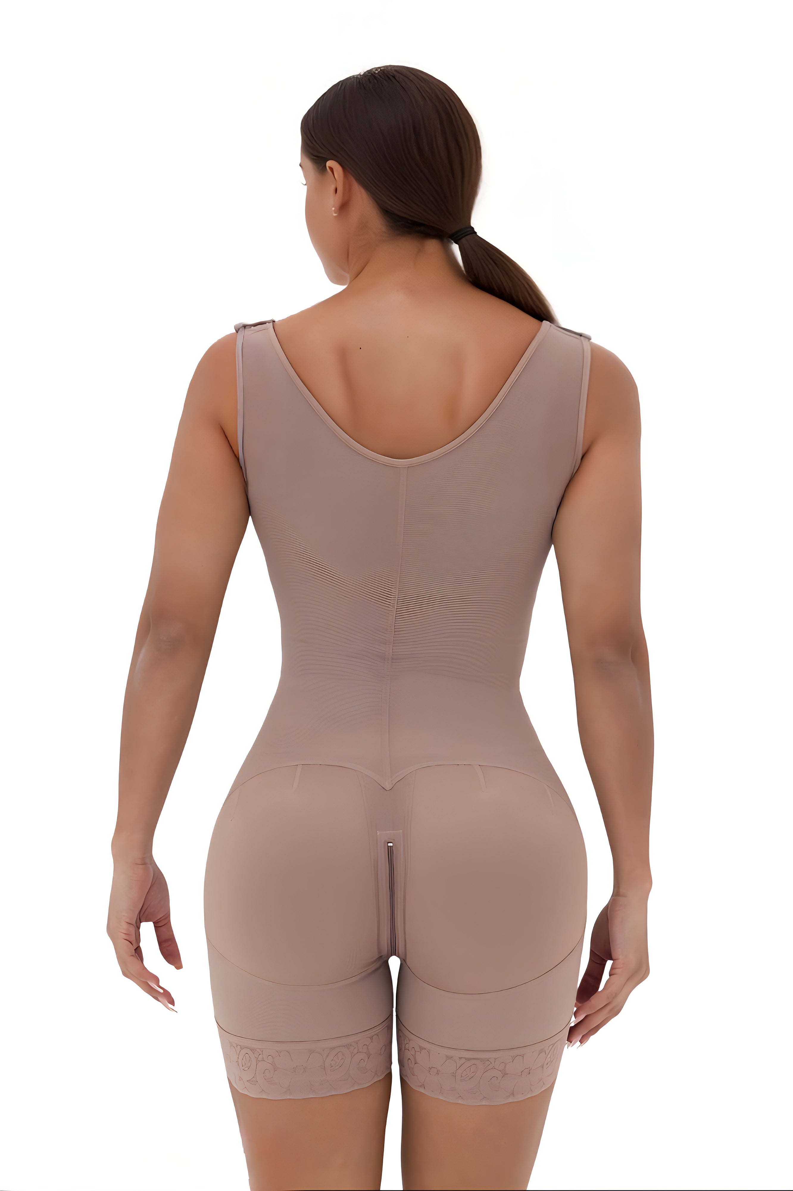 Achieve an effortlessly sculpted look with our Cheeky Faja with Built-in Bra & Strong Compression. This all-in-one garment offers comprehensive control and enhancement. Its front hook closure makes it easy to put on, while the perineal zipper provides ultimate convenience for daily wear. This faja provides full back coverage, effectively shaping your figure and styling your torso. Additionally, it features a pronounced butt-lifting design that visibly elevates and defines, creating a more contoured and feminine silhouette.